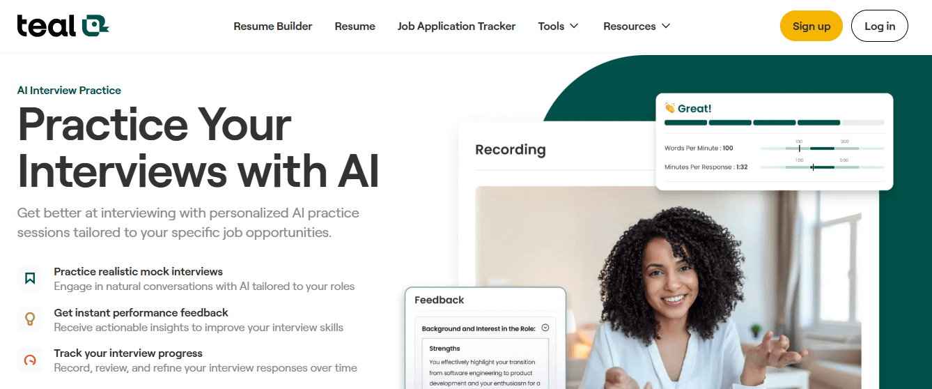 Teal delivers immediate, comprehensive feedback following every practice session. It offers valuable insights on aspects such as speaking pace and the quality of your responses, helping you refine your interview abilities.