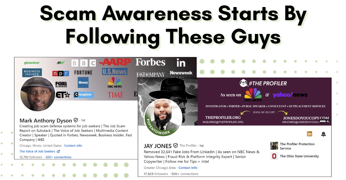 Scams are on the rise. What are you doing to stay informed and vigilant? I strongly encourage you to follow these two people for their regular insights into scams targeting job seekers plus many other scams and LinkedIn profile impersonation and fakes.